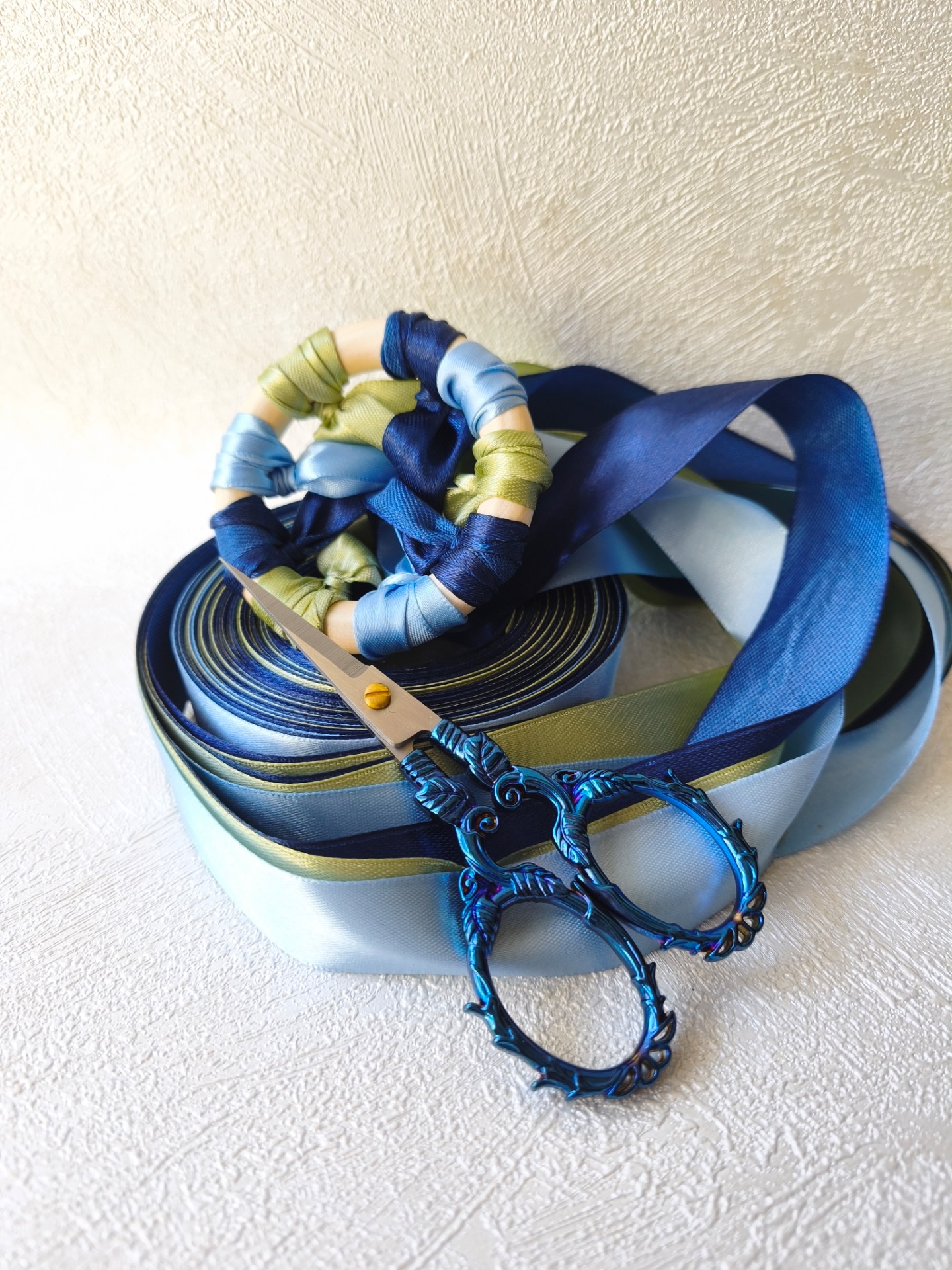 Svěží jako ranní rosa. Elegantní kombinace šalvějově zelených a královsky modrých saténových stuh pro přírodní a snovou atmosféru vašeho rituálu.