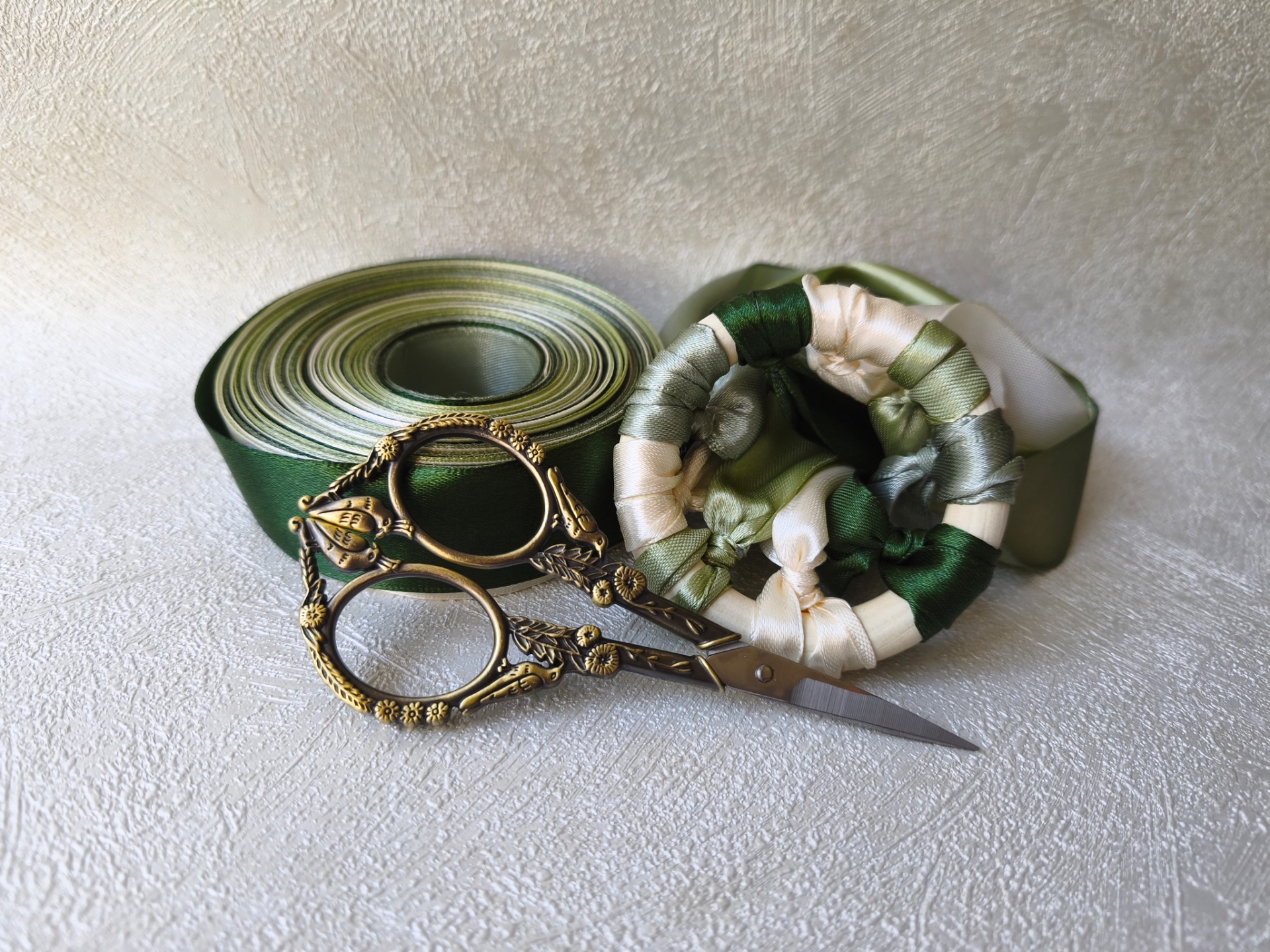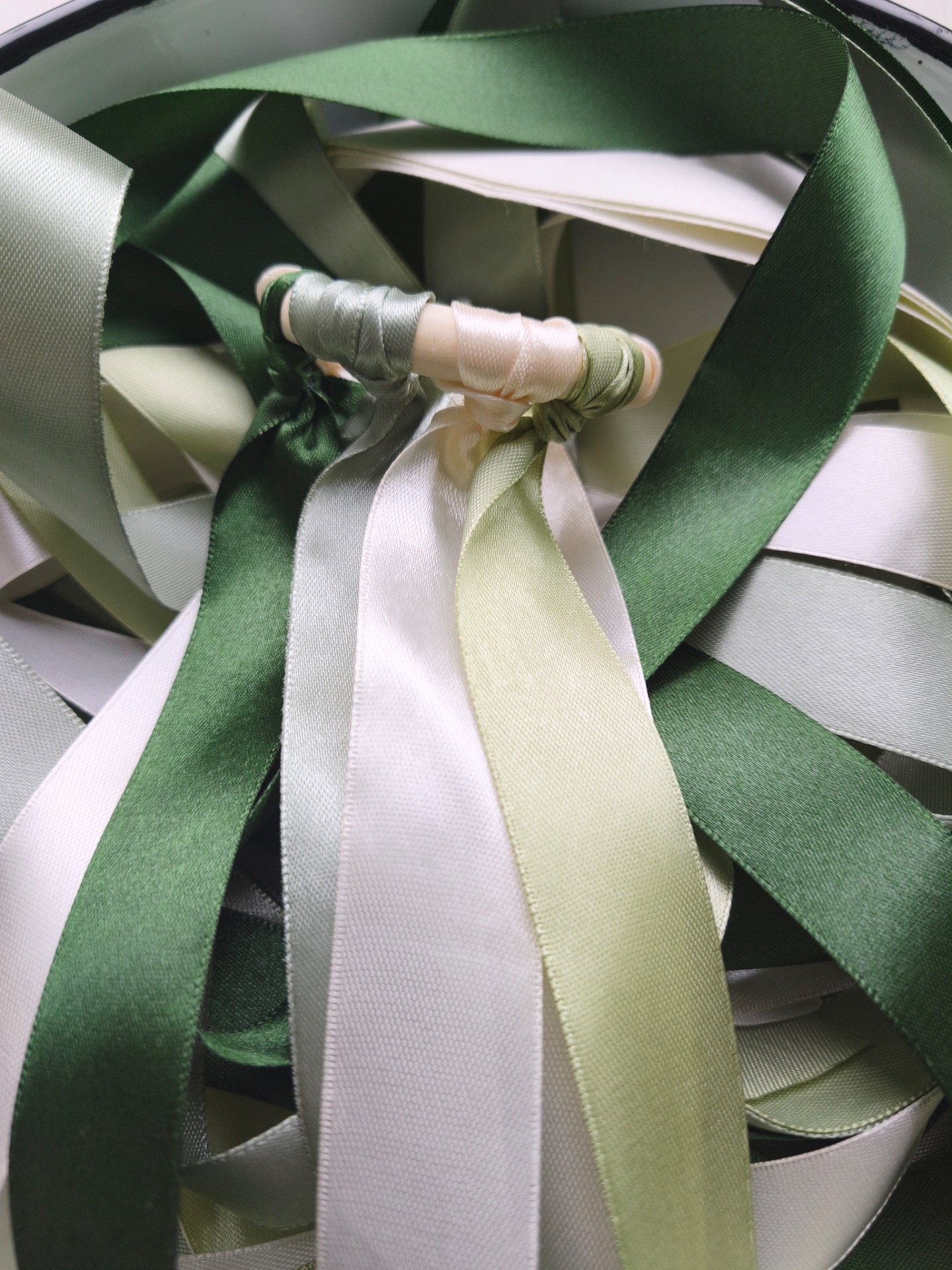 Vznešenost a dotek přírody v jednom. Harmonické spojení sytě smaragdových a jemně krémových saténových stuh pro nezapomenutelné vyplétání svatební kytice.